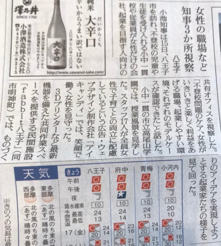 小池百合子東京都知事が、「fabbit八王子」を視察された記事が読売新聞に掲載されました。