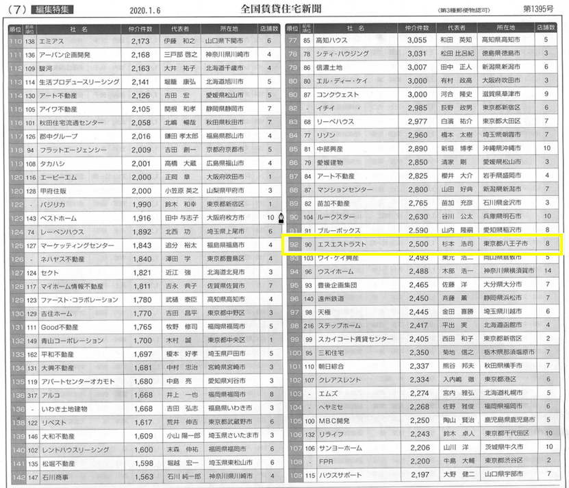 全国賃貸住宅新聞 賃貸仲介数ランキング92位にランクインしました。 | 株式会社エスエストラスト