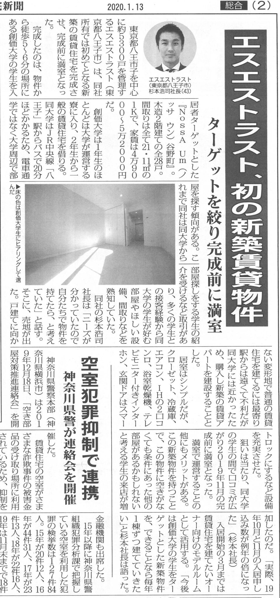 全国賃貸住宅新聞に当社新築物件「NossA Um(ノッサ ウン)」について掲載していただきました。 | 株式会社エスエストラスト
