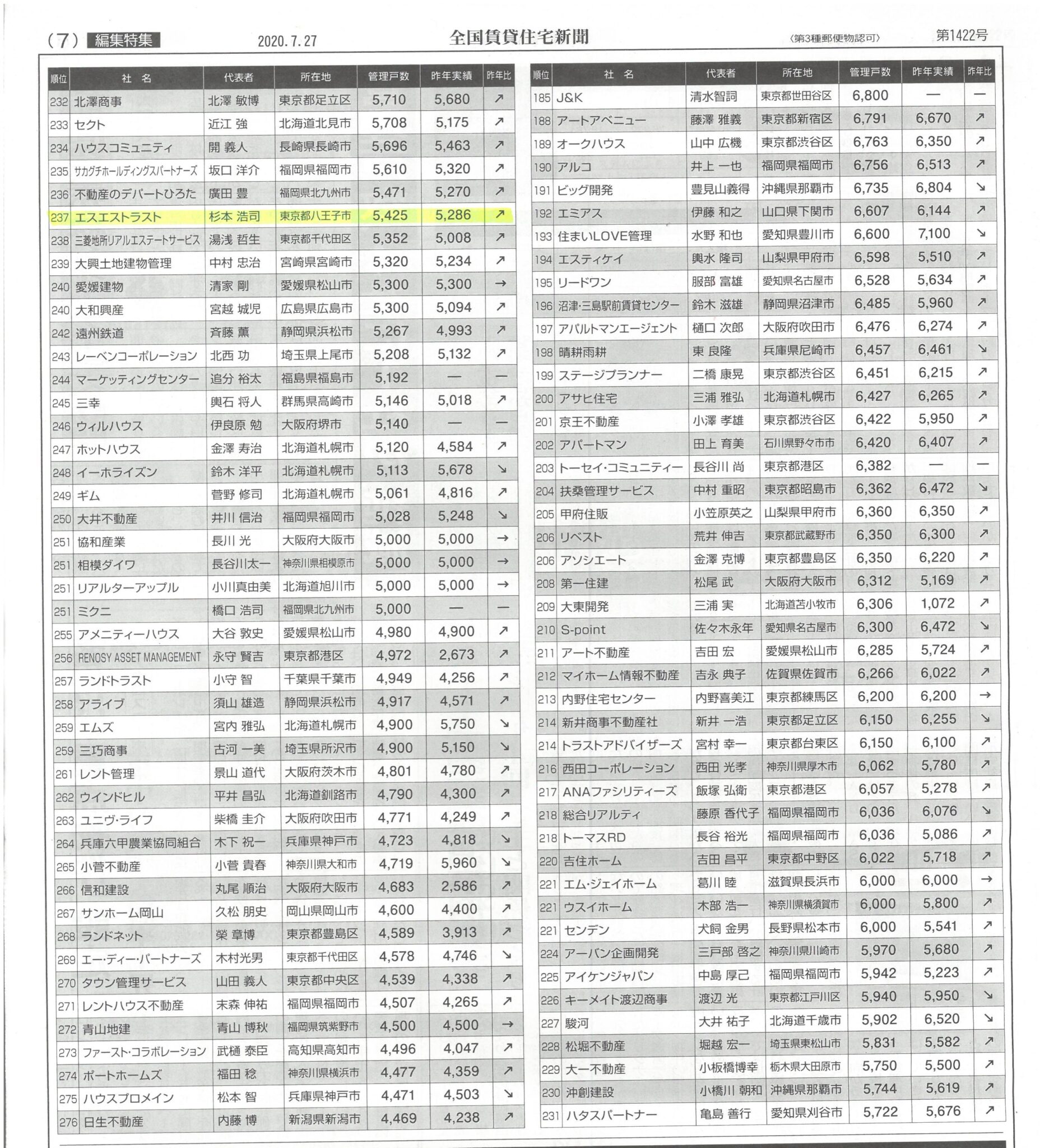 全国賃貸住宅新聞 管理戸数ランキング2020 | 株式会社エスエストラスト