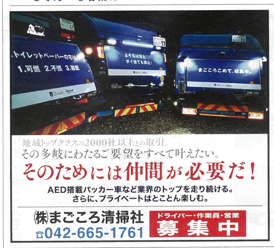 まごころ清掃社様の求人広告に、当社とコラボレーションしたごみ収集車の写真をお使いいただきました。