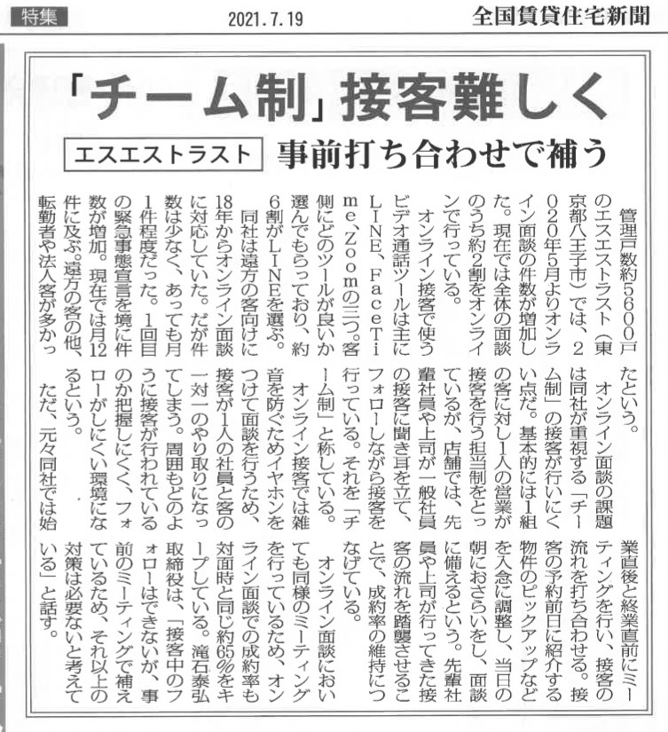 全国賃貸住宅新聞に、当社のオンライン接客について掲載していただきました。 | 株式会社エスエストラスト