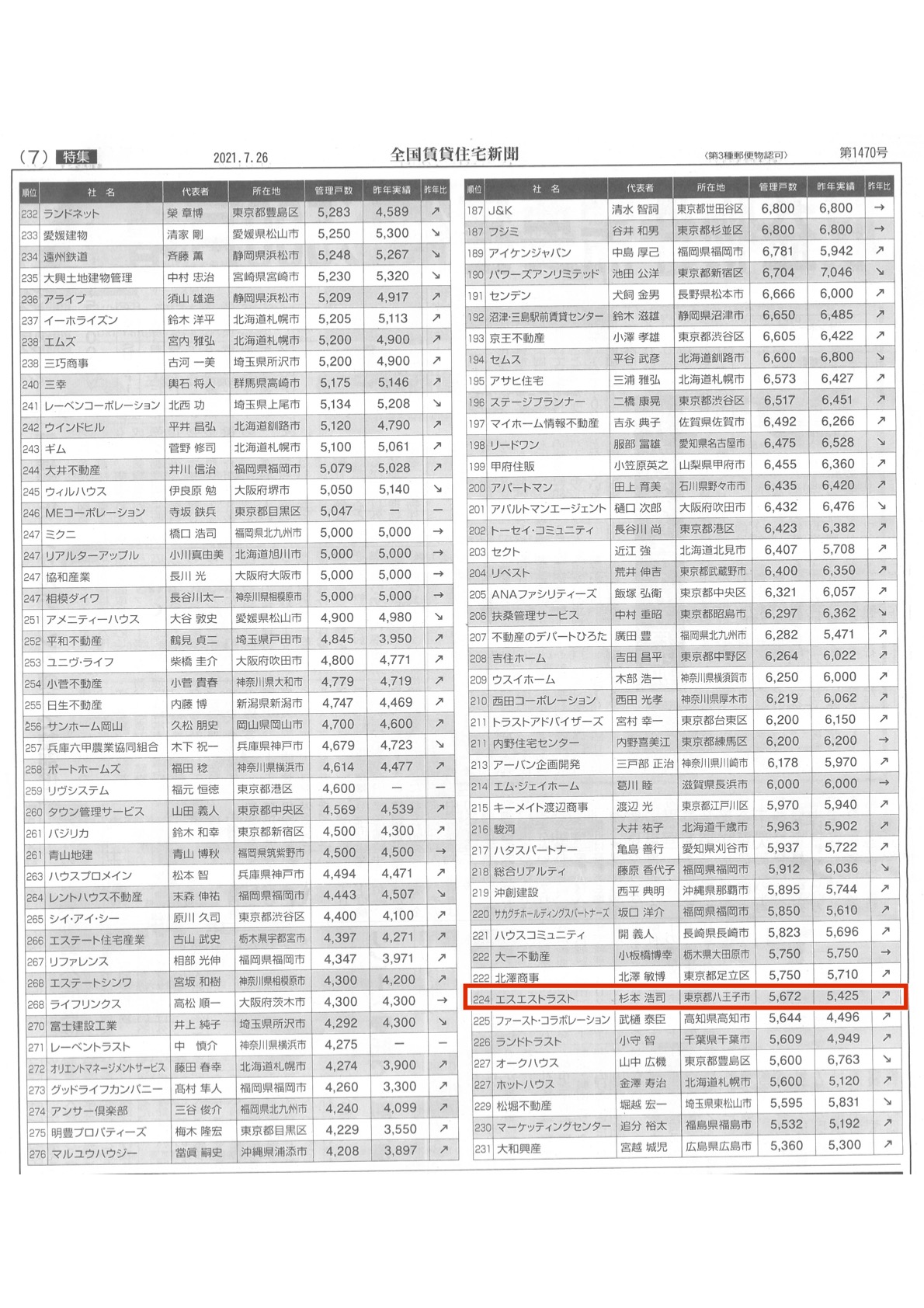 全国賃貸住宅新聞 管理戸数ランキング2021 | 株式会社エスエストラスト