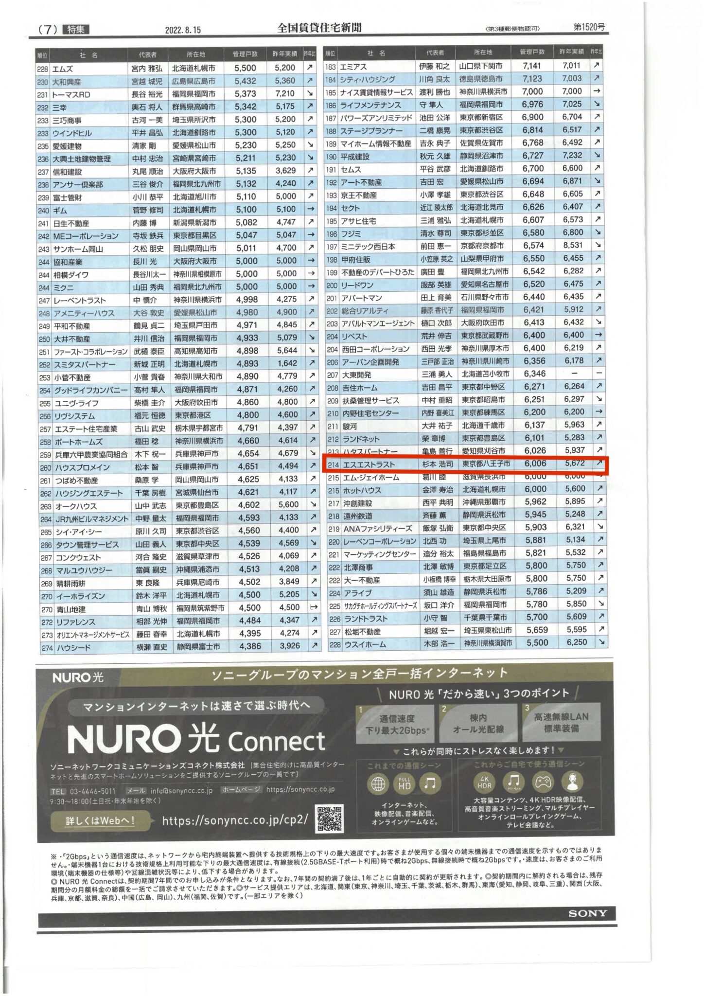 全国賃貸住宅新聞 管理戸数ランキング2022 | 株式会社エスエストラスト