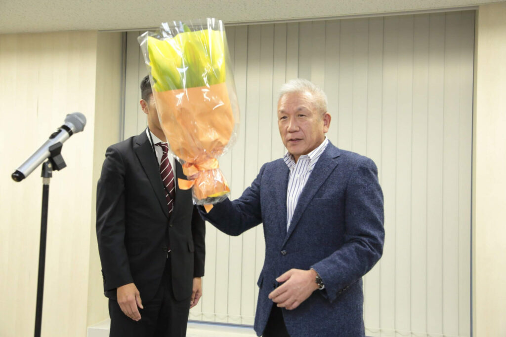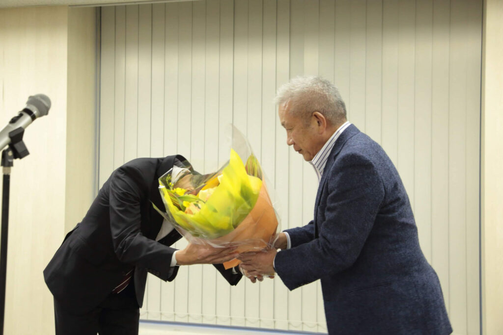 私は代表で花束贈呈! なんとも私の顔隠れて、絶妙ですわ笑