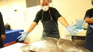 北野の築地物流機構の、あかしマグロ解体ショー。たらふくマグロ食べました!