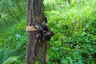 前日にはバナナの焼酎付をストッキングで木にしかけといて