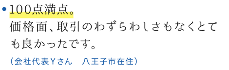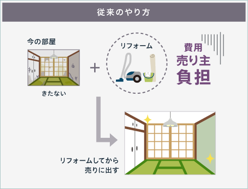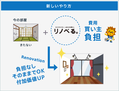 当社は東京西部では唯一、「リノべる。」と業務提携。「リノべる。」は中古マンションの内装をフルリフォーム・リノベーションする業者で、この業界の最先端を走る企業です。当社にご売却の依頼をいただいた物件を「リノべる。」のお客様へご紹介。フルリフォーム前提のお客様ですから、クリーニングをしたり破損箇所を直したりする必要がありません。