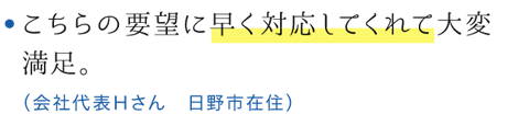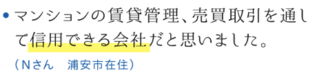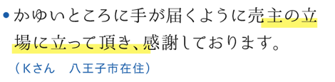 当社が多摩地区中心に毎月発行しているオーナー様向け情報誌『三方よし』に物件情報を掲載するなど、すでにご購入依頼をされているお客様へいち早くご紹介いたします。その他、インターネット・提携企業・地元金融機関のネットワークを通じ情報発信することにより、この物件を必要としているお客様を幅広くお探しします。現在問題になっている不動産業者による「物件の囲い込み(他不動産業者に物件を紹介させないこと)」を当社は行ないません。売主様からご依頼いただいた物件は、他不動産業者様にも紹介していただけるよう、売主様の立場に立ってお客様にご紹介していきます。