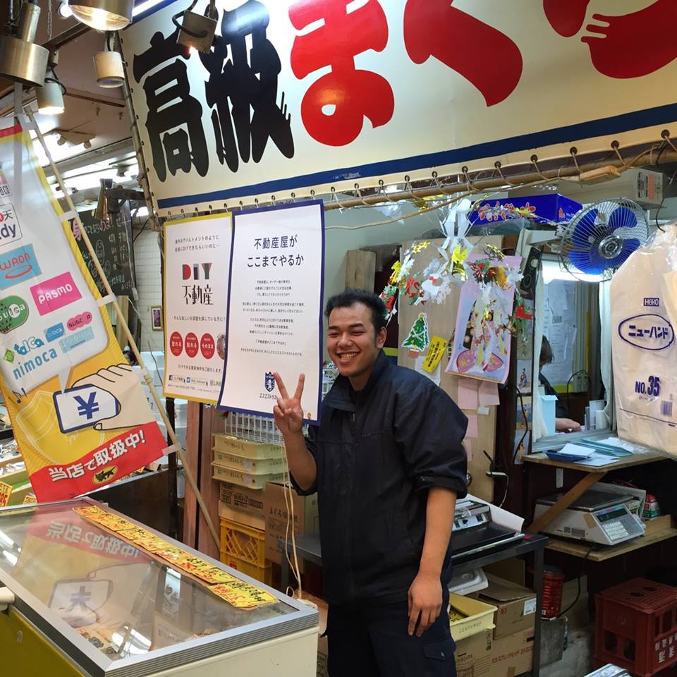 “DIY不動産”のポスターを八王子総合卸売市場の高級まぐろの“築地物流”さんに