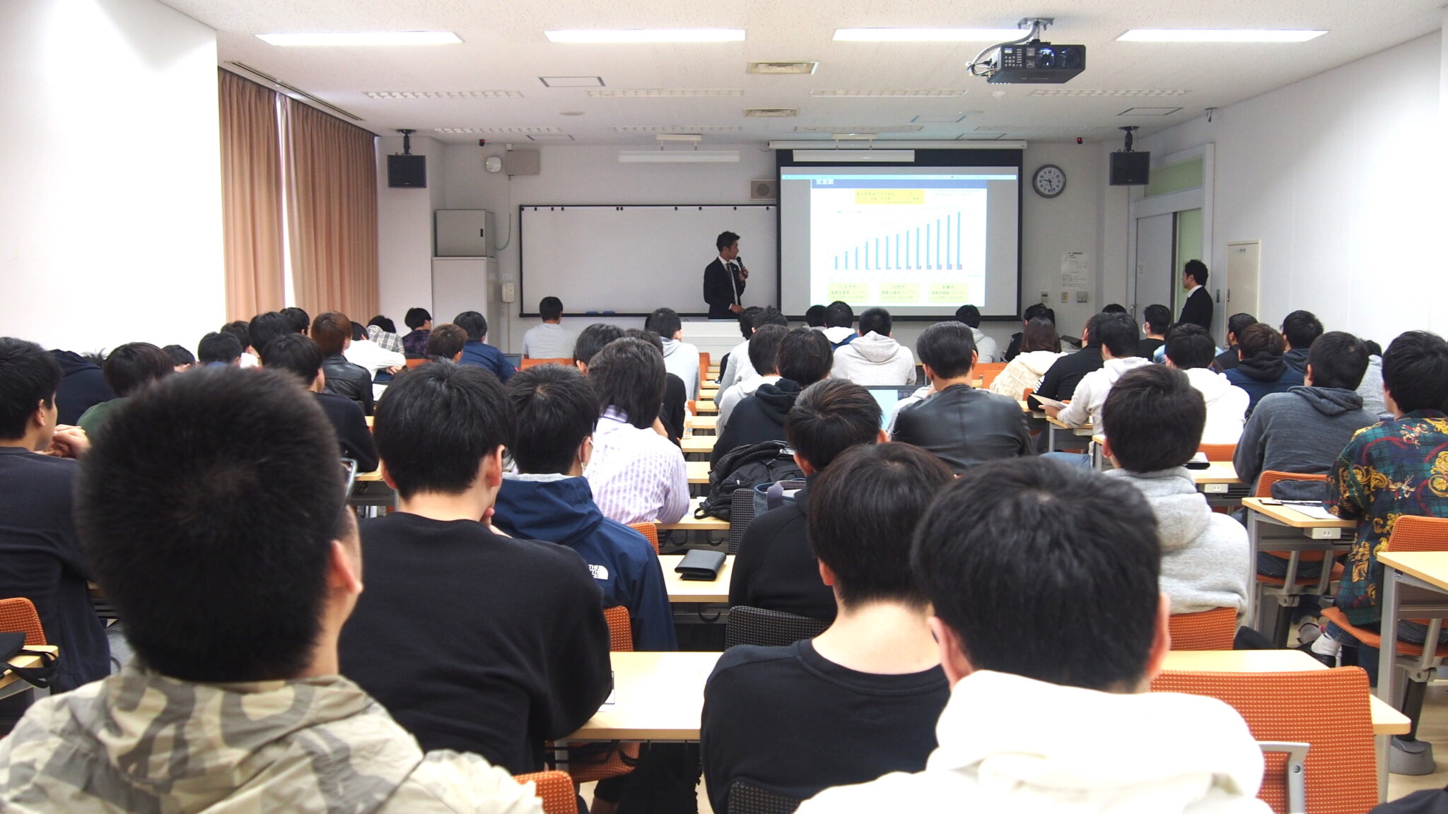 この授業は、毎回様々な業種の企業さんが講師をして、それぞれの業界について学生さんに理解を深め、その業界の醍醐味や面白さ、厳しさを知ってもらい、将来の職業の選択のひとつとしてもらうことを目的にしているそうです。