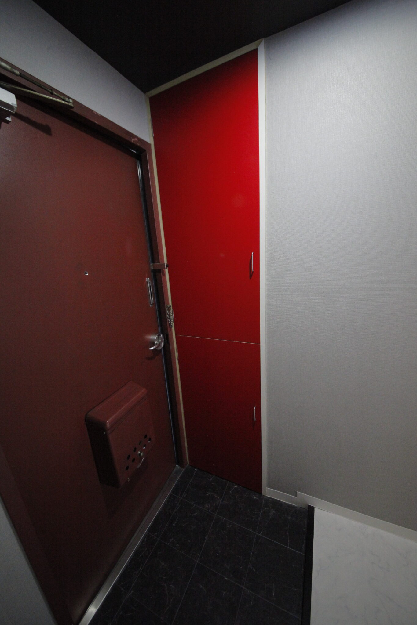 派手に、玄関は赤のシューズボックスが目立つよう、天井は黒色を選択しています。