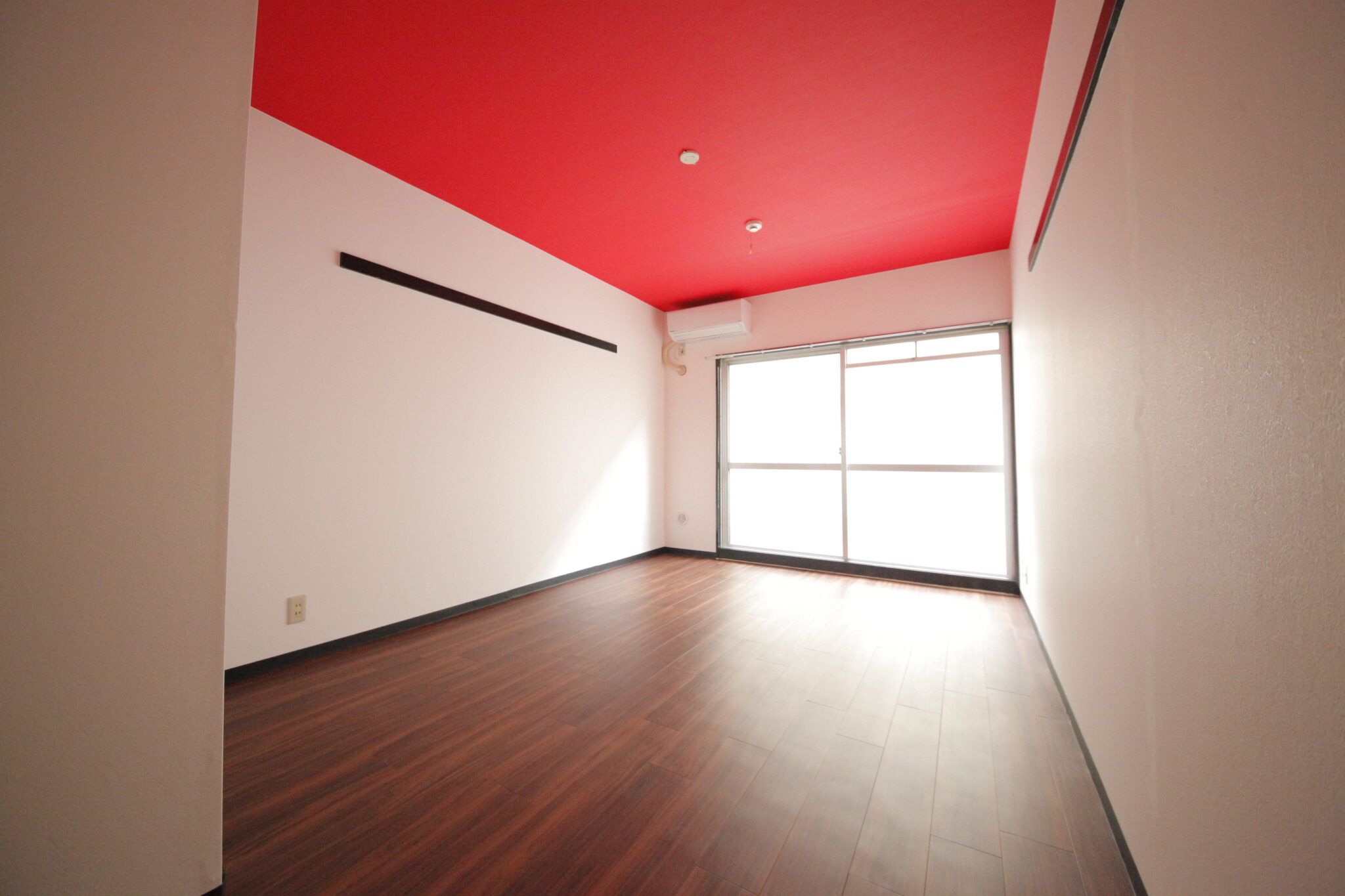 床材や壁紙を変更するのはよく見かけますが、今回は天井を赤一色で