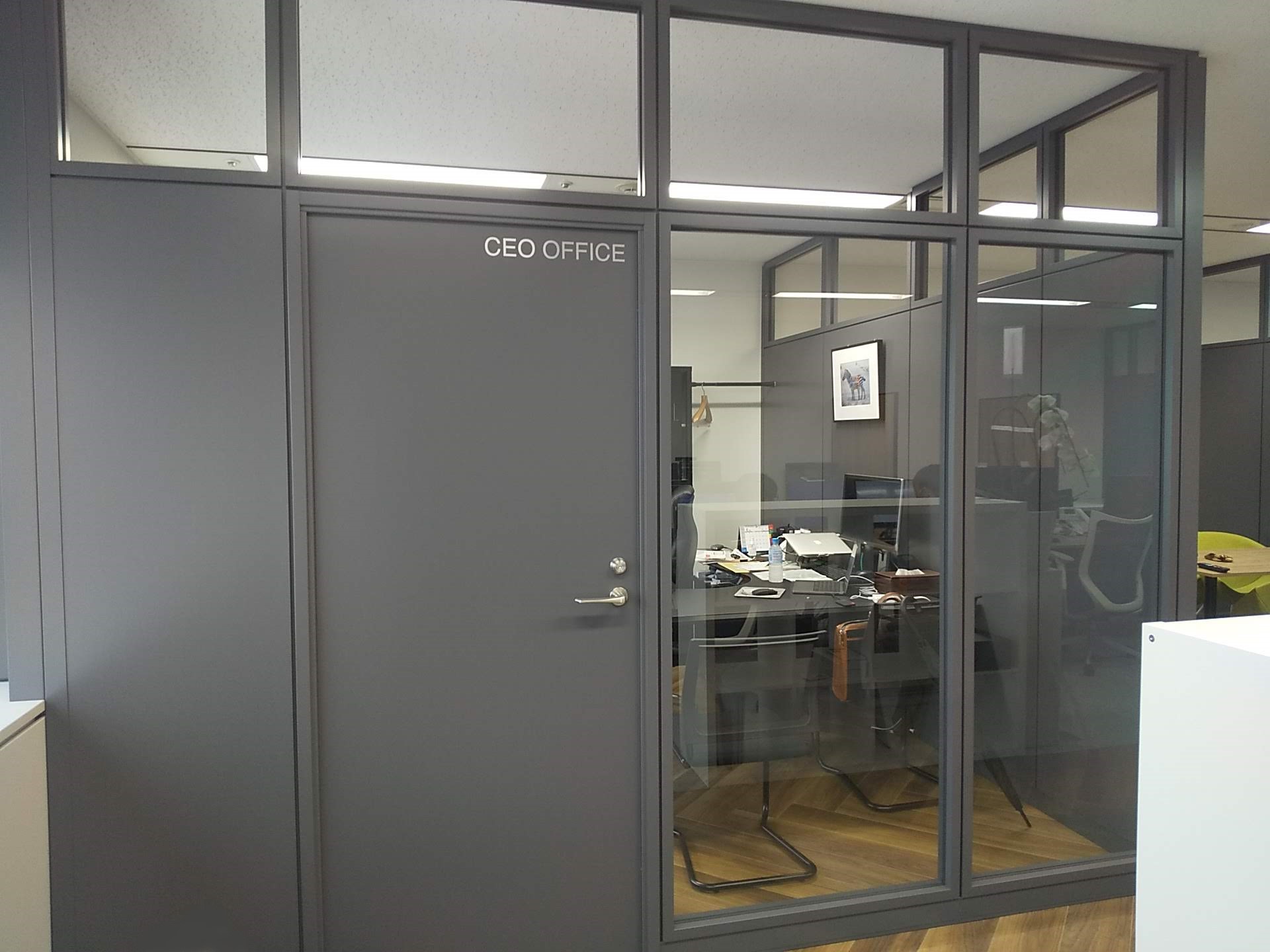 社長室や休憩コーナー、会議室のレイアウトが絶妙で、デスクや椅子のデザインやカラー、棚の配置などがとても素敵なオフィスです。