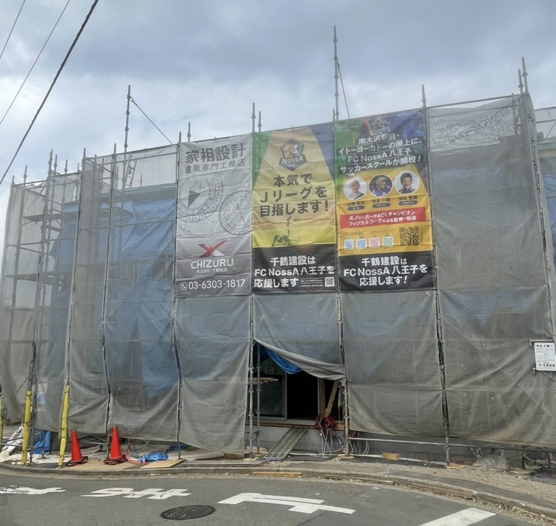 株式会社千鶴建設様とお施主様のご厚意により、谷野町A棟B棟の建設現場にFC NossA八王子とスクールの応援幕をつけてくださいました✨